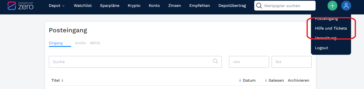 Dies ist die schnellste und einfachste Möglichkeit, den ZERO-Kundenservice zu kontaktieren. Melden Sie sich einfach in Ihrem ZERO-Depot an und klicken auf "Hilfe und Tickets": https://mein.finanzen-zero.net/posteingang