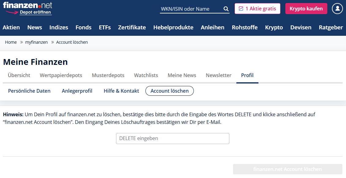Klicke auf „Account löschen“, um Deinen finanzen.net Account zu löschen: https://www.finanzen.net/account/delete-account