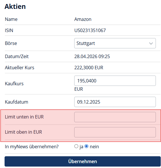 Gib deinen Zielkurs (Limit unten in EUR oder Limit oben in EUR) ein und speichere die Einstellung.