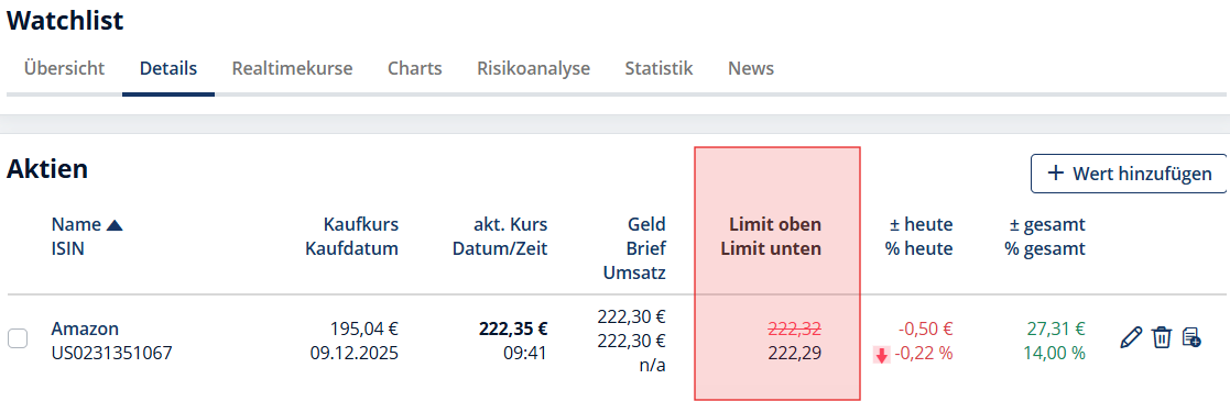 Aktuell bieten wir keinen E-Mail-Service für Limit-Benachrichtigungen an. Wir empfehlen dir daher, regelmäßig einen Blick in deine Watchliste zu werfen, um keine Kurschance zu verpassen.