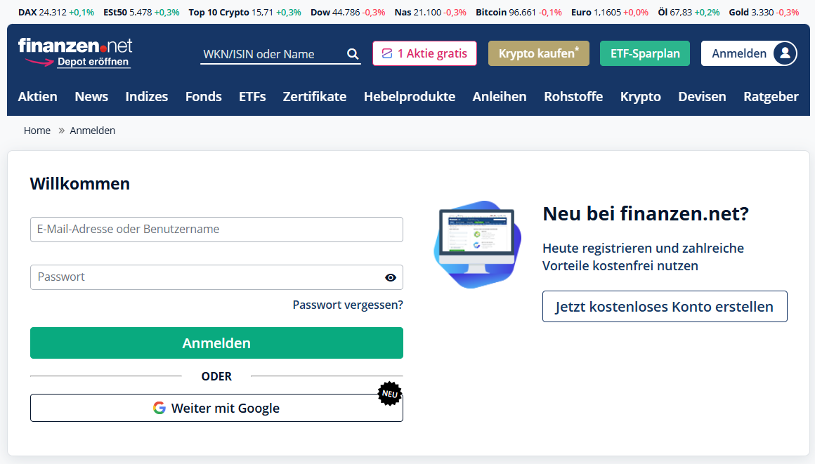Um dich anzumelden, gehe zu https://www.finanzen.net/ und klicke auf "Anmelden".